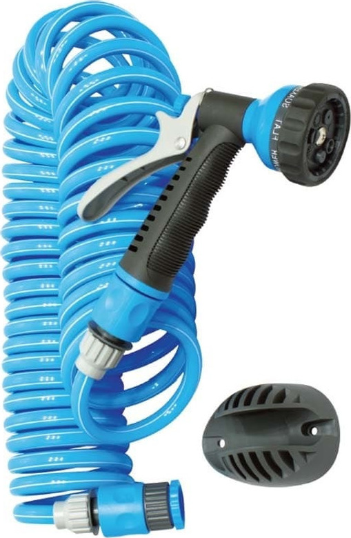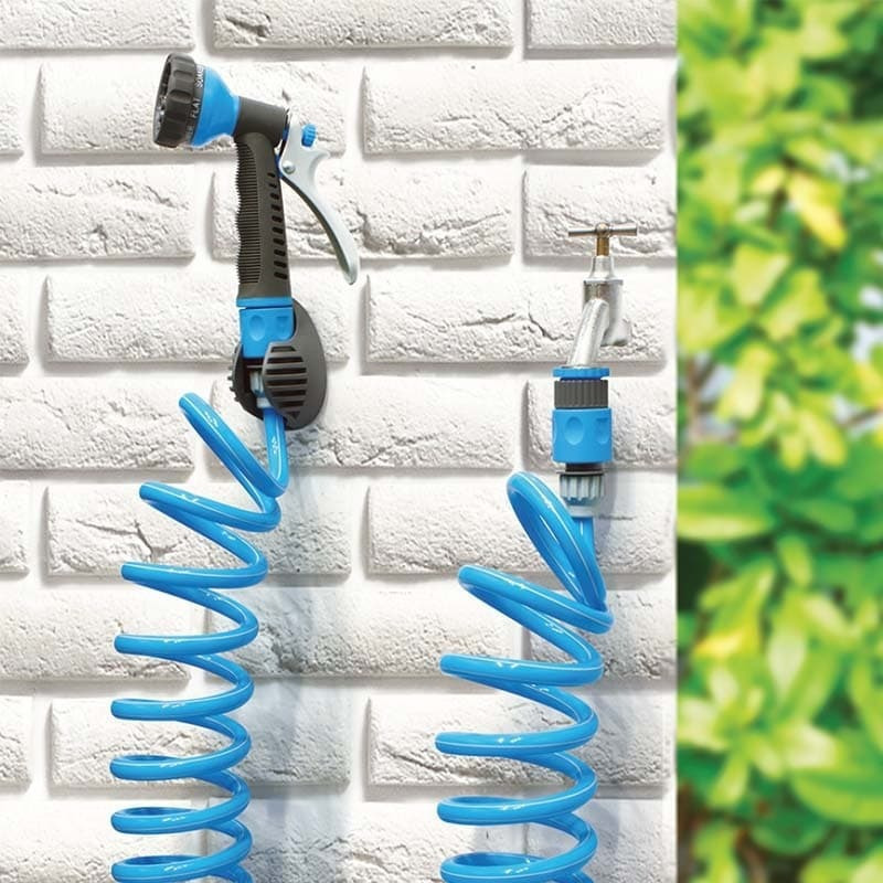 Λάστιχο σπιράλ σετ 20m. Κατάλληλο για πότισμα σε βεράντες, μπαλκόνια ή μικρούς κήπους. Περιλαμβάνει συνδέσμους, πιστόλι ψεκασμού και βάση στήριξης. Aπό ανθεκτικό πλαστικό.