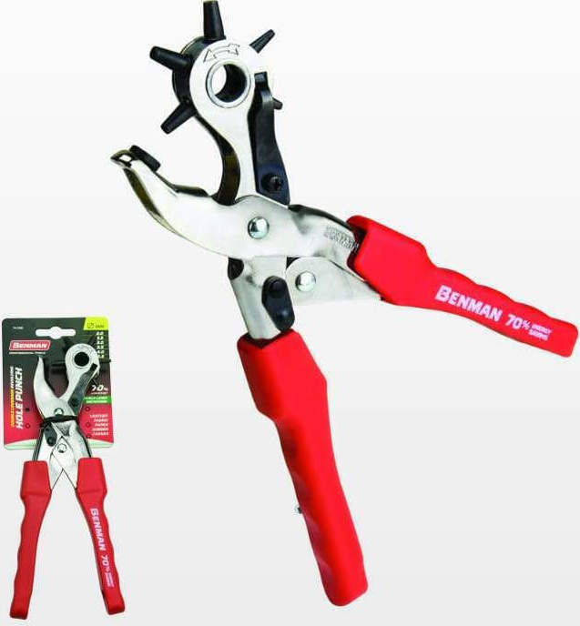 Η πένσα διάνοιξης οπών Benman δίνει δυνατότητα τρυπήματος σε διάφορα μεγέθη χάρη στις 6 διαφορετικές κεφαλές που διαθέτει. Είναι ιδανική για διάνοιξη τρυπών σε μαλακά υλικά όπως ύφασμα, χαρτί, καουτσούκ και μουσαμά. Η εργονομική της λαβή την καθιστά κατάλληλη για πολύωρη, ξεκούραστη χρήση.