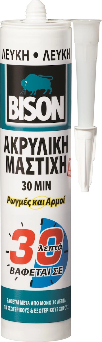 Μαστίχη Bison 30min 300ML, ακρυλική, γενικής χρήσης, με δυνατότητα βαφής μετά από 30 λεπτά, σε λευκή απόχρωση. Κατάλληλη για σφράγισμα ρωγμών και αρμών και για εσωτερικούς και εξωτερικούς χώρους. Bison 30min Ακρυλική Συγκολλητική Μαστίχη Ξύλου Λευκή 300ml