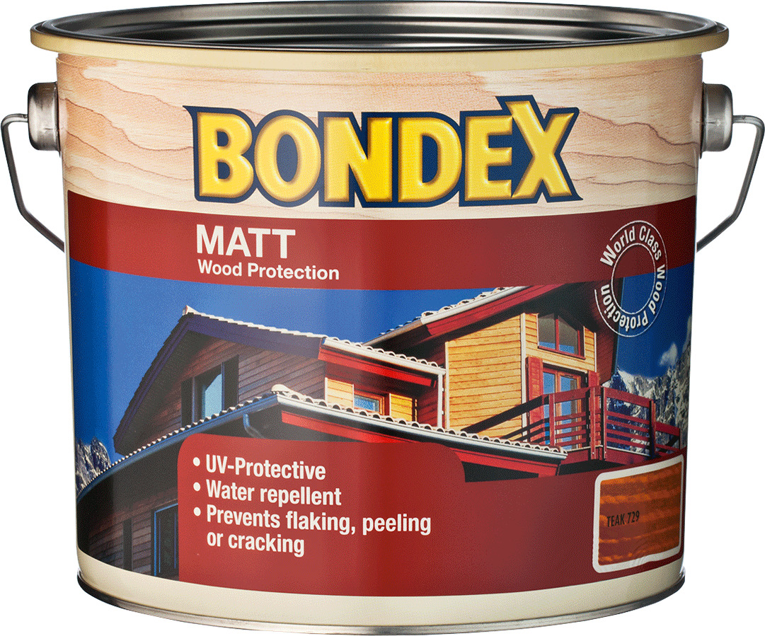 Το Bondex Matt Wood Protection είναι προϊόν ανθεκτικό στις καιρικές συνθήκες και τη βροχή. Οι μικροπορώδεις χρωστικές του εισχωρούν μέσα στο ξύλο, δίνοντας του τη μέγιστη δυνατή προστασία από την ηλιακή ακτινοβολία. Το BONDEX Wood Protection δε δημιουργεί φιλμ στην επιφάνεια του ξύλου και δε σκάει ποτέ. Διακοσμεί το ξύλο αφήνοντας τα νερά του να φαίνονται και το προστατεύει από την κυάνωση και τους μύκητες. Η τεχνολογία βραδείας αποδέσμευσης ( Long Effect) απελευθερώνει τα ενεργά συστατικά του μόνο όταν χρειάζεται, κάνοντας το περισσότερο ανθεκτικό.Εξωτερικής και εσωτερικής χρήσης.