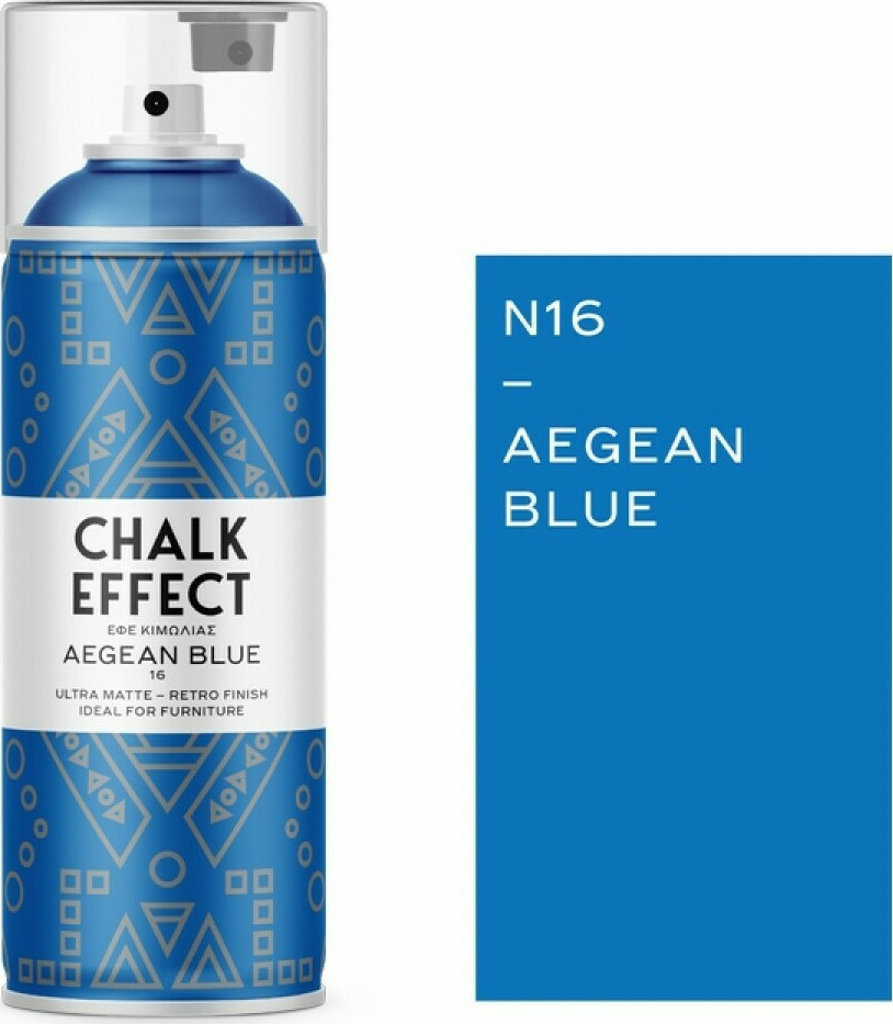 Χρώματα Σπρέι Εφέ Κιμωλίας Spray COSMOS LAC CHALK EFFECT AEGEAN BLUE ΣΠΡΕΙ ΕΦΕ ΚΙΜΩΛΙΑΣ N16 400ml με ματ φινίρισμα για έπιπλα και διακοσμητικά αντικείμενα. Αναζωογονήστε τα έπιπλα και τη διακόσµηση του σπιτιού σας µε απαράµιλλη κοµψότητα. Αποκαταστήστε τα παλιά σας έπιπλα και διακοσμητικά αντικείμενα δίνοντας τους ένα εντυπωσιακό ματ φινίρισμα με τον πιο εύκολο και δημιουργικό τρόπο. Ιδανικό για DIY και επαγγελματική χρήση στις περισσότερες επιφάνειες: ξύλο, μέταλλο, ανοξείδωτο ατσάλι, γυαλί, κεραμικά, πέτρα, ύφασμα, χαρτί και άλλα. Δεν στάζει, δεν χρειάζεται αστάρι, καλύπτει μέχρι και 4m², ενώ ο ειδικός ψεκασμός του Cosmos Chalk Effect ελαχιστοποιεί το χρόνο βαφής. Δώστε νέα ζωή στα παλιά σας έπιπλα, σε 15 λεπτά.