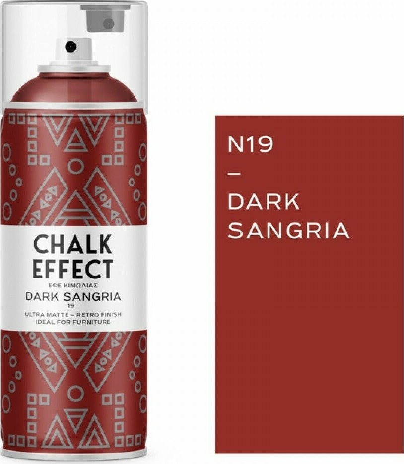Χρώματα Σπρέι Εφέ Κιμωλίας Spray COSMOS LAC CHALK EFFECT DARK SANGRIA ΣΠΡΕΙ ΕΦΕ ΚΙΜΩΛΙΑΣ N19 400ml με ματ φινίρισμα για έπιπλα και διακοσμητικά αντικείμενα. Αναζωογονήστε τα έπιπλα και τη διακόσµηση του σπιτιού σας µε απαράµιλλη κοµψότητα. Αποκαταστήστε τα παλιά σας έπιπλα και διακοσμητικά αντικείμενα δίνοντας τους ένα εντυπωσιακό ματ φινίρισμα με τον πιο εύκολο και δημιουργικό τρόπο. Ιδανικό για DIY και επαγγελματική χρήση στις περισσότερες επιφάνειες: ξύλο, μέταλλο, ανοξείδωτο ατσάλι, γυαλί, κεραμικά, πέτρα, ύφασμα, χαρτί και άλλα. Δεν στάζει, δεν χρειάζεται αστάρι, καλύπτει μέχρι και 4m², ενώ ο ειδικός ψεκασμός του Cosmos Chalk Effect ελαχιστοποιεί το χρόνο βαφής. Δώστε νέα ζωή στα παλιά σας έπιπλα, σε 15 λεπτά.