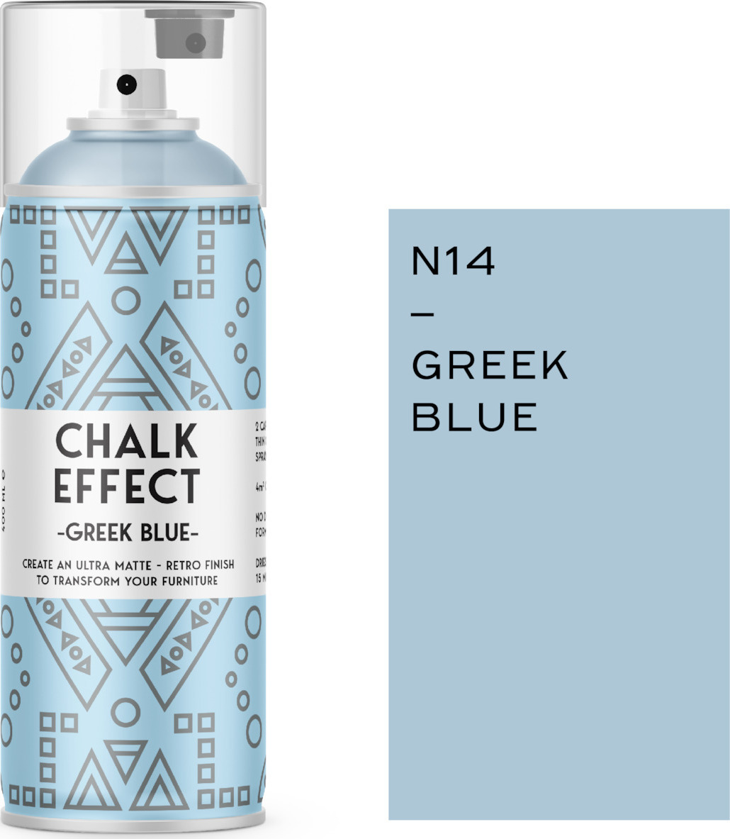 Χρώματα Σπρέι Εφέ Κιμωλίας Spray COSMOS LAC CHALK EFFECT GREEK BLUE ΣΠΡΕΙ ΕΦΕ ΚΙΜΩΛΙΑΣ N14 400ml με ματ φινίρισμα για έπιπλα και διακοσμητικά αντικείμενα. Αναζωογονήστε τα έπιπλα και τη διακόσµηση του σπιτιού σας µε απαράµιλλη κοµψότητα. Αποκαταστήστε τα παλιά σας έπιπλα και διακοσμητικά αντικείμενα δίνοντας τους ένα εντυπωσιακό ματ φινίρισμα με τον πιο εύκολο και δημιουργικό τρόπο. Ιδανικό για DIY και επαγγελματική χρήση στις περισσότερες επιφάνειες: ξύλο, μέταλλο, ανοξείδωτο ατσάλι, γυαλί, κεραμικά, πέτρα, ύφασμα, χαρτί και άλλα. Δεν στάζει, δεν χρειάζεται αστάρι, καλύπτει μέχρι και 4m², ενώ ο ειδικός ψεκασμός του Cosmos Chalk Effect ελαχιστοποιεί το χρόνο βαφής. Δώστε νέα ζωή στα παλιά σας έπιπλα, σε 15 λεπτά.