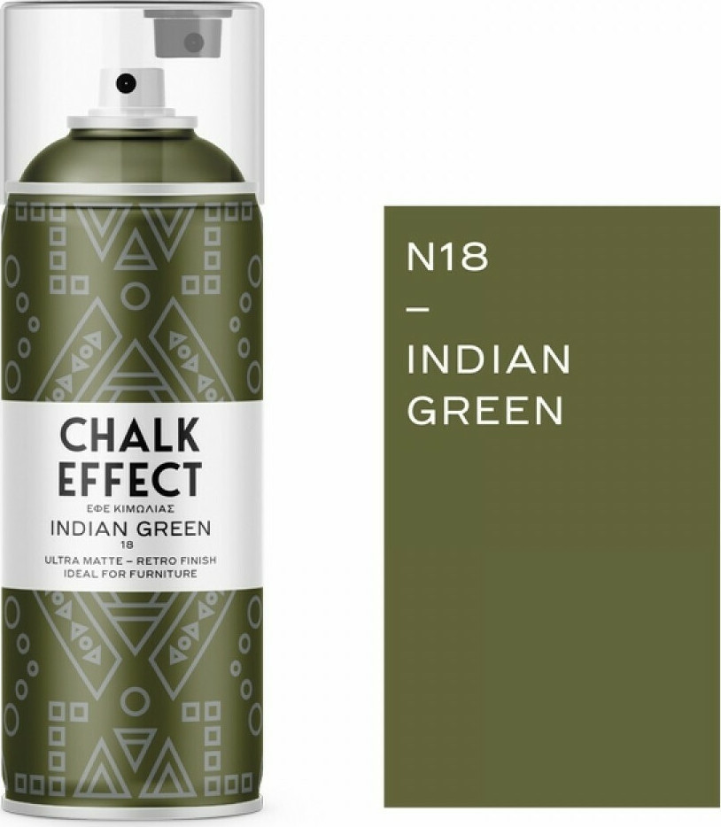 Χρώματα Σπρέι Εφέ Κιμωλίας Spray COSMOS LAC CHALK EFFECT INDIAN GREEN ΣΠΡΕΙ ΕΦΕ ΚΙΜΩΛΙΑΣ N18 400ml με ματ φινίρισμα για έπιπλα και διακοσμητικά αντικείμενα. Αναζωογονήστε τα έπιπλα και τη διακόσµηση του σπιτιού σας µε απαράµιλλη κοµψότητα. Αποκαταστήστε τα παλιά σας έπιπλα και διακοσμητικά αντικείμενα δίνοντας τους ένα εντυπωσιακό ματ φινίρισμα με τον πιο εύκολο και δημιουργικό τρόπο. Ιδανικό για DIY και επαγγελματική χρήση στις περισσότερες επιφάνειες: ξύλο, μέταλλο, ανοξείδωτο ατσάλι, γυαλί, κεραμικά, πέτρα, ύφασμα, χαρτί και άλλα. Δεν στάζει, δεν χρειάζεται αστάρι, καλύπτει μέχρι και 4m², ενώ ο ειδικός ψεκασμός του Cosmos Chalk Effect ελαχιστοποιεί το χρόνο βαφής. Δώστε νέα ζωή στα παλιά σας έπιπλα, σε 15 λεπτά.