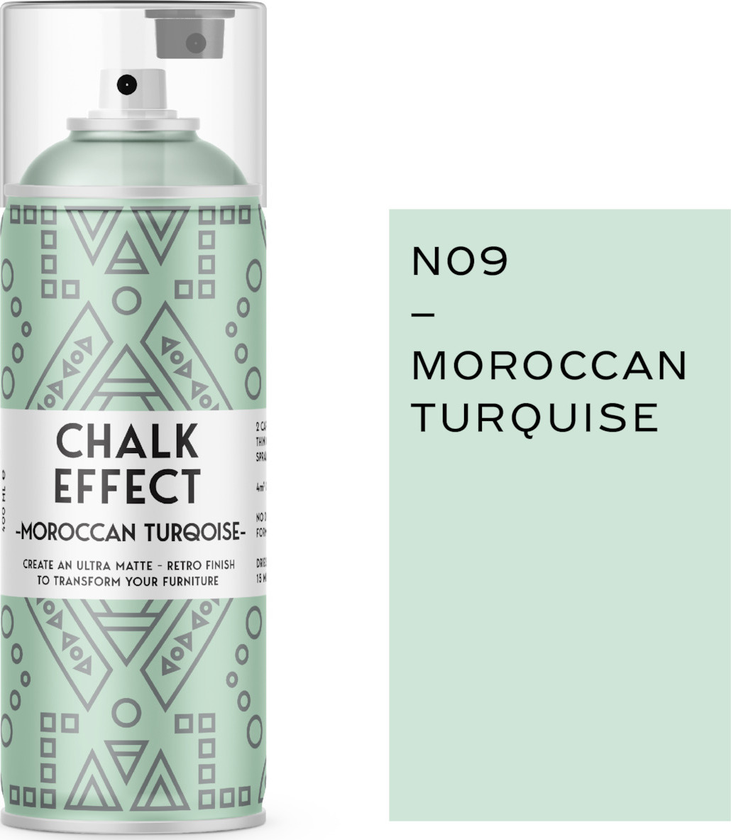 Χρώματα Σπρέι Εφέ Κιμωλίας Spray COSMOS LAC CHALK EFFECT MOROCCAN TURQOISE ΣΠΡΕΙ ΕΦΕ ΚΙΜΩΛΙΑΣ N09 400ml με ματ φινίρισμα για έπιπλα και διακοσμητικά αντικείμενα. Αναζωογονήστε τα έπιπλα και τη διακόσµηση του σπιτιού σας µε απαράµιλλη κοµψότητα. Αποκαταστήστε τα παλιά σας έπιπλα και διακοσμητικά αντικείμενα δίνοντας τους ένα εντυπωσιακό ματ φινίρισμα με τον πιο εύκολο και δημιουργικό τρόπο. Ιδανικό για DIY και επαγγελματική χρήση στις περισσότερες επιφάνειες: ξύλο, μέταλλο, ανοξείδωτο ατσάλι, γυαλί, κεραμικά, πέτρα, ύφασμα, χαρτί και άλλα. Δεν στάζει, δεν χρειάζεται αστάρι, καλύπτει μέχρι και 4m², ενώ ο ειδικός ψεκασμός του Cosmos Chalk Effect ελαχιστοποιεί το χρόνο βαφής. Δώστε νέα ζωή στα παλιά σας έπιπλα, σε 15 λεπτά.