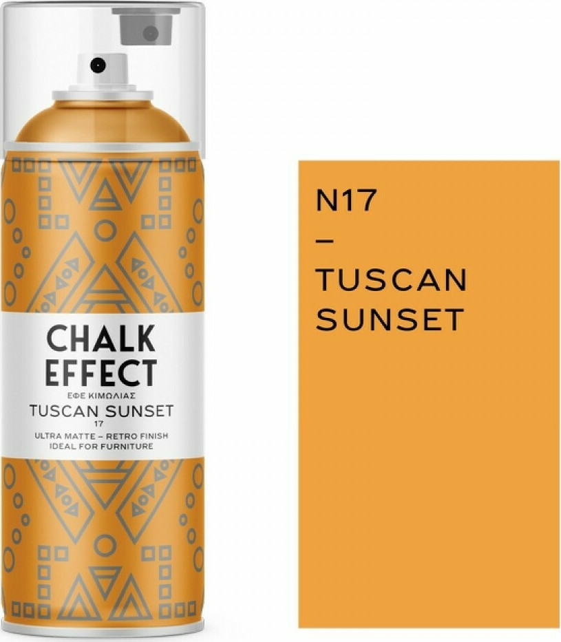 Χρώματα Σπρέι Εφέ Κιμωλίας Spray COSMOS LAC CHALK EFFECT TUSCAN SUNSET ΠΟΡΤΟΚΑΛΙ ΕΦΕ ΚΙΜΩΛΙΑΣ N17 400ml με ματ φινίρισμα για έπιπλα και διακοσμητικά αντικείμενα. Αναζωογονήστε τα έπιπλα και τη διακόσµηση του σπιτιού σας µε απαράµιλλη κοµψότητα. Αποκαταστήστε τα παλιά σας έπιπλα και διακοσμητικά αντικείμενα δίνοντας τους ένα εντυπωσιακό ματ φινίρισμα με τον πιο εύκολο και δημιουργικό τρόπο. Ιδανικό για DIY και επαγγελματική χρήση στις περισσότερες επιφάνειες: ξύλο, μέταλλο, ανοξείδωτο ατσάλι, γυαλί, κεραμικά, πέτρα, ύφασμα, χαρτί και άλλα. Δεν στάζει, δεν χρειάζεται αστάρι, καλύπτει μέχρι και 4m², ενώ ο ειδικός ψεκασμός του Cosmos Chalk Effect ελαχιστοποιεί το χρόνο βαφής. Δώστε νέα ζωή στα παλιά σας έπιπλα, σε 15 λεπτά.