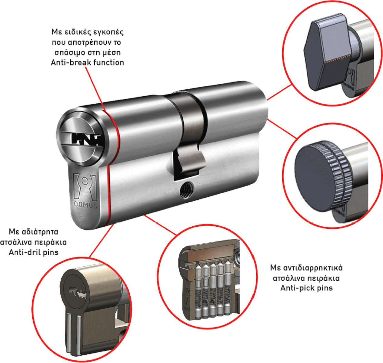 | Χαρακτηριστικά ασφάλειας | Κλειδιά με βούλες / Εγκοπές που αποτρέπουν το σπάσιμο στη μέση / Αδιάτρητα αστάλινα πειράκια / Αντιδιαρρηκτικά ατσάλινα πειράκια |