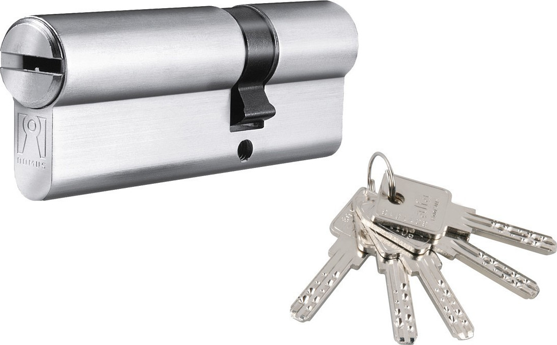 Ο κύλινδρος ασφαλείας Domus Econ, 83 mm (30-53) με φινίρισμα νίκελ ταιριάζει σε όλες τις χωνευτές κλειδαριές. Διατίθεται με 5 κλειδιά με βούλες στην συσκευασία.