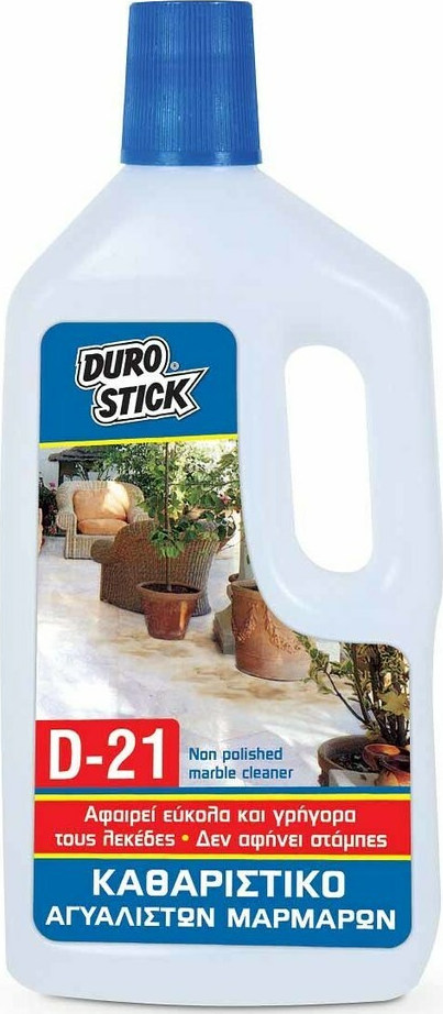 Καθαριστικό αγυάλιστων μαρμάρων, ισχυρότατο καθαριστικό αγυάλιστων μαρμάρων και μωσαϊκών. Δρα άμεσα και αποτελεσματικά, με ελάχιστο τρίψιμο. Απομακρύνει λεκέδες από πότισμα γλαστρών σε βεράντες, σε χώρους με λευκά ή χρωματιστά μάρμαρα. Καθαρίζει ρύπους από κατοικίδια ζώα, καυσαέρια, σκουριές από κάγκελα, λεκέδες από καπνιά, λάδια, λίπη, κρασί, καφέ, μελάνι, αναψυκτικά κ.ά. Durostick D-21 Καθαριστικό αγυάλιστων μαρμάρων