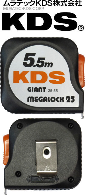 Μέτρο της KDS Giant Megalock των 5.5 μέτρων και φάρδος μετροταινίας 25mm. Διαθέτει κουμπί ασφάλισης-απασφάλισης της λάμας. Με κινητό γάντζο άκρης για ακρίβεια σε εσωτερικές και εξωτερικές μετρήσεις (true zero). Είναι κατασκευασμένο από ισχυρό ελαστικό πλαστικό υλικό κάνοντας το άθραυστο ακόμα και αν σας πέσει από τα χέρια και δεν πληγώνει την επιφάνεια με την οποία θα έρθει σε επαφή.