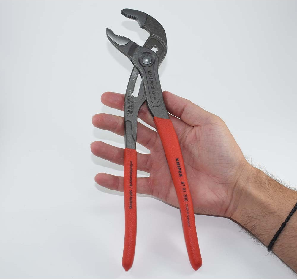 KNIPEX Cobra – Η HiTech Γκαζοτανάλια. Όχι πια χαμένος χρόνος για να βρείτε το σωστό άνοιγμα. Απλώς τοποθετήστε το πάνω μάγουλο του εργαλείου στο προς συγκράτηση αντικείμενο, πιέστε το κουμπί και μετακινήστε το κάτω μάγουλο του εργαλείου μέχρι να ασφαλίσει.
