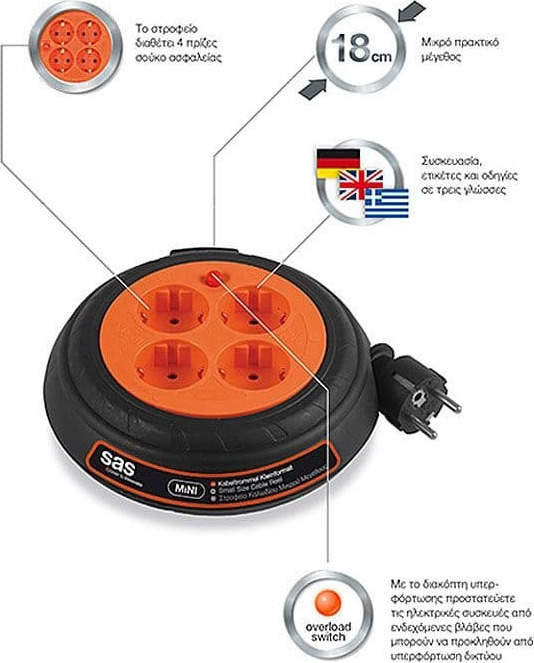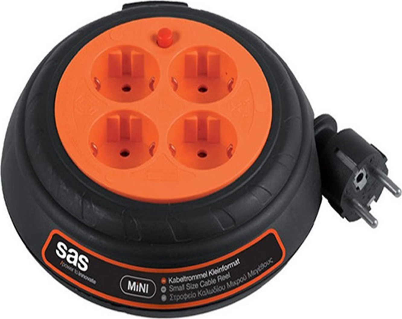 Μπαλαντέζα σε καρούλι, κλειστού τύπου, της SAS με θέσεις για 4 πρίζες και καλώδιο μήκους 3 μέτρων, σε μαύρο χρώμα. Το καλώδιο έχει διατομή 1.5mm² που σημαίνει πως η μέγιστη κατανάλωση των συνδεδεμένων συσκευών δεν θα πρέπει να υπερβαίνει τα 3600W που ισοδυναμούν, για παράδειγμα, με την ισχύ που απαιτεί ένα στεγνωτήριο ρούχων για να λειτουργήσει.
