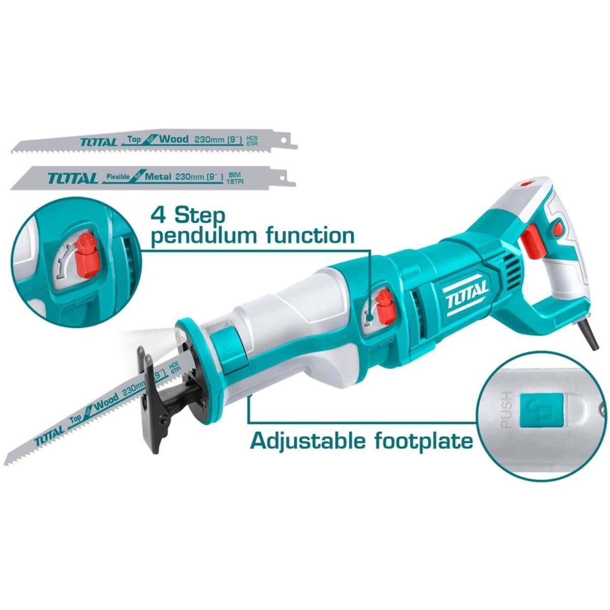 Σπαθοσέγα ρεύματος της εταιρείας Total με ισχύ 1200W. Χρησιμοποιείται για κοπή υλικών όπως το ξύλο, το μέταλλο και το αλουμίνιο με δυνατότητα χρήσης λάμας διαφόρων μεγέθους. Έχει δυνατότητα προσαρμογής της ταχύτητας έως 2800rpm. Μπορεί να κόψει ξύλο μέχρι 210mm, μέταλλο μέχρι 20mm και αλουμίνιο μέχρι 10mm.