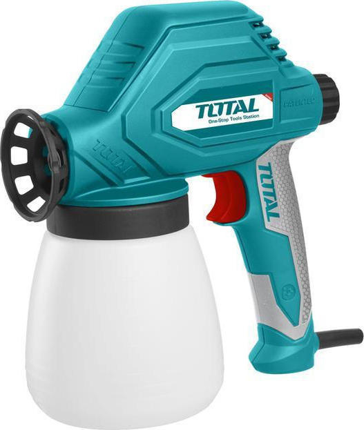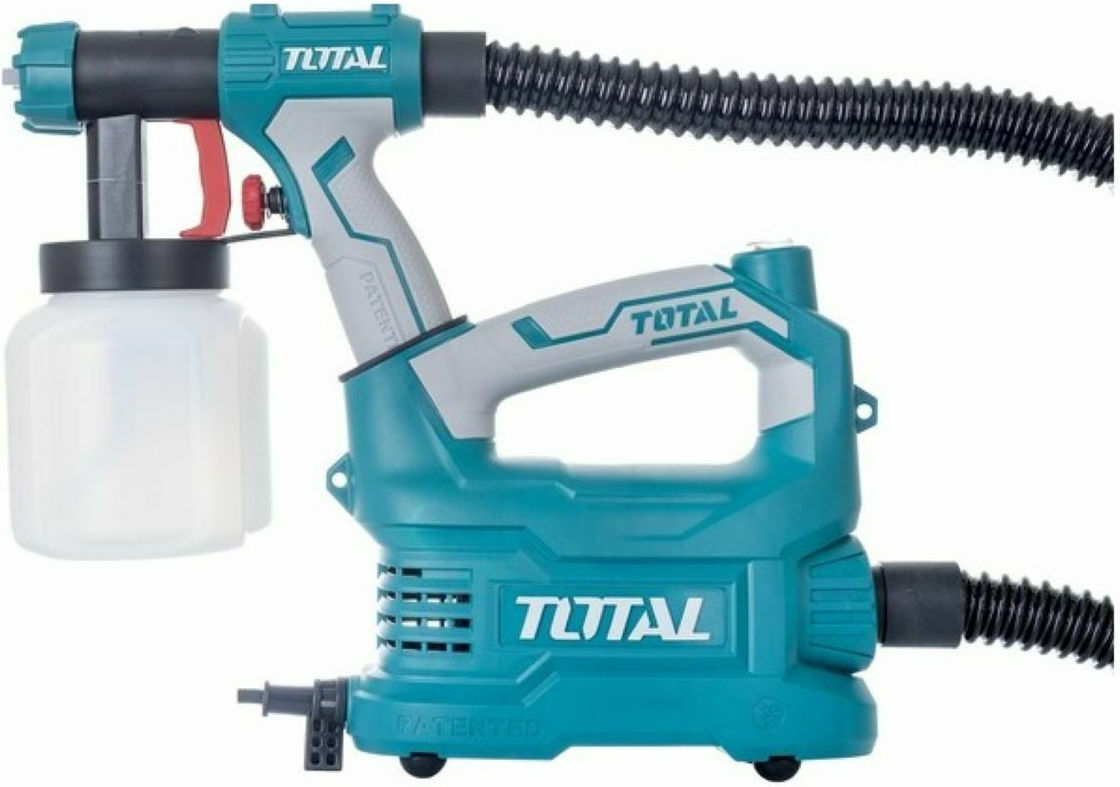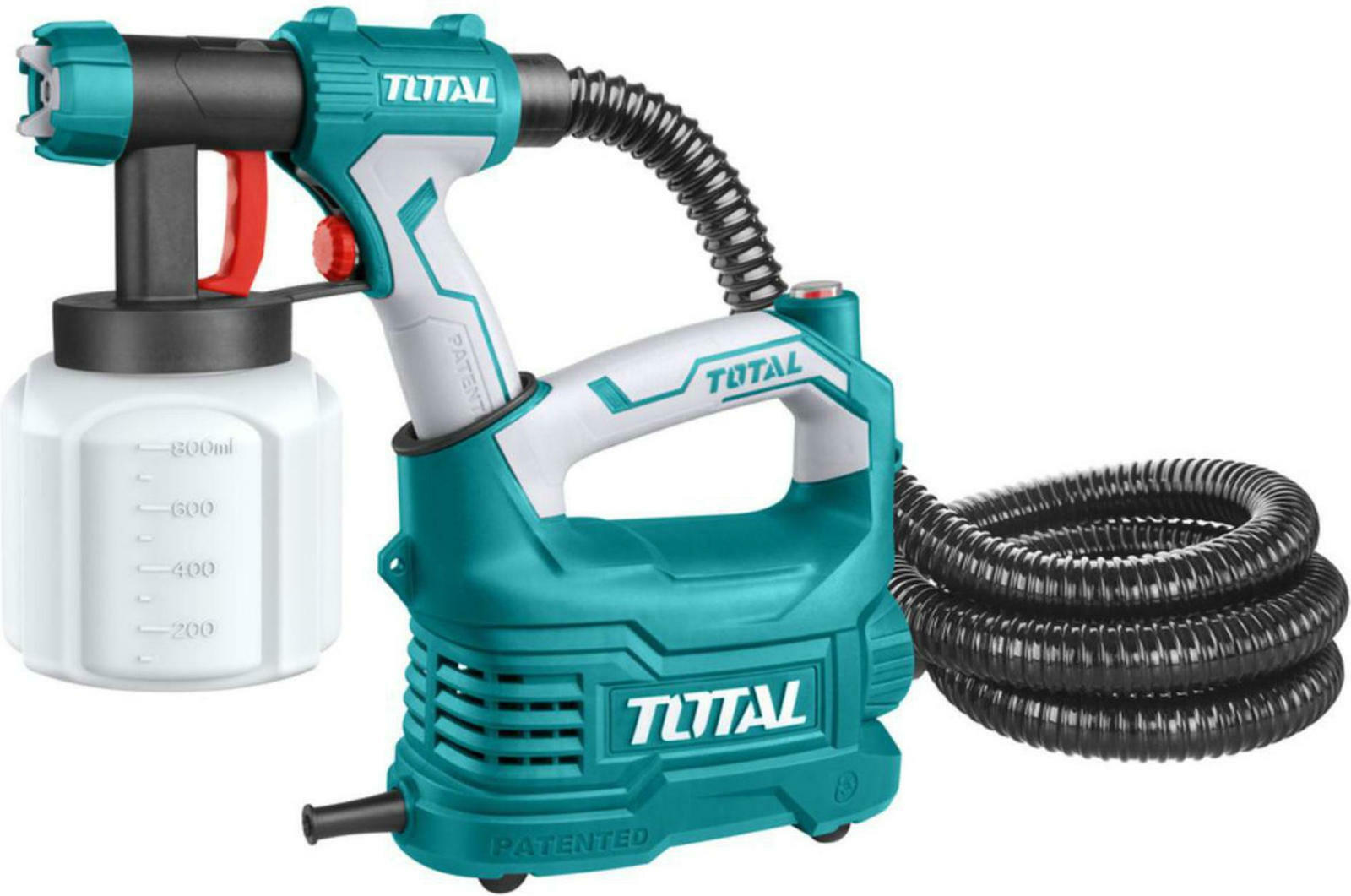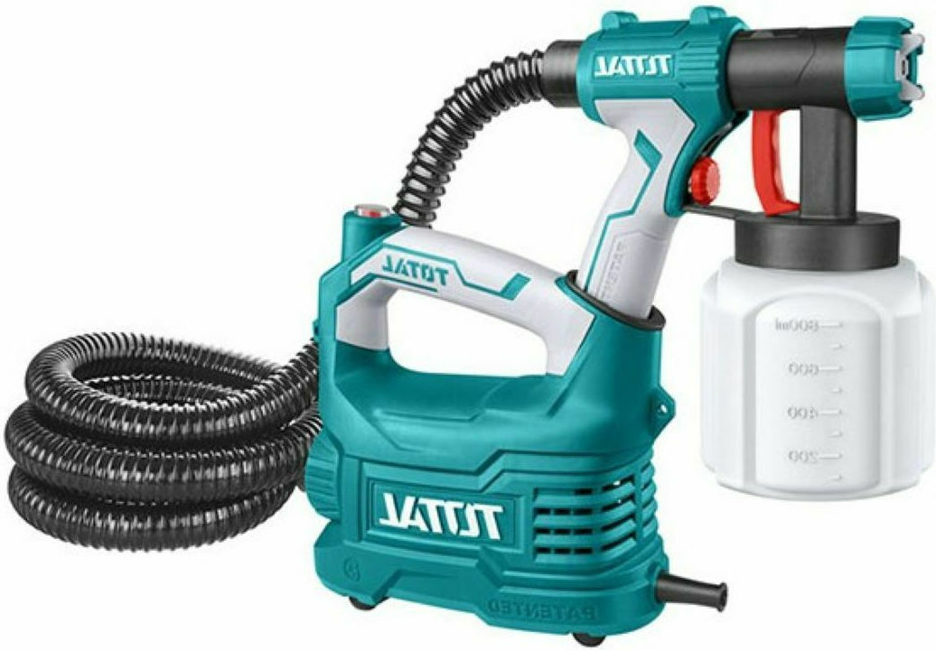 Πιστόλι βαφής ρεύματος από τον κατασκευαστή Total με ισχύ 500W. Χρησιμοποιείται για γρήγορη και εύκολη ολοκλήρωση όλων των εργασιών βαφής σε μέταλλο, τοιχοποιία και ξύλο. Διαθέτει δοχείο μικρού μεγέθους χωρητικότητας 0.8lt που δεν αυξάνει το βάρος του μηχανήματος κατά τη διάρκεια της χρήσης του αλλά αναλόγως με το εμβαδόν της επιφάνειας βαφής μπορεί να χρειαστεί αρκετές φορές γέμισμα. Έχει ελαφριά κατασκευή καθώς ζυγίζει 1.5kg.