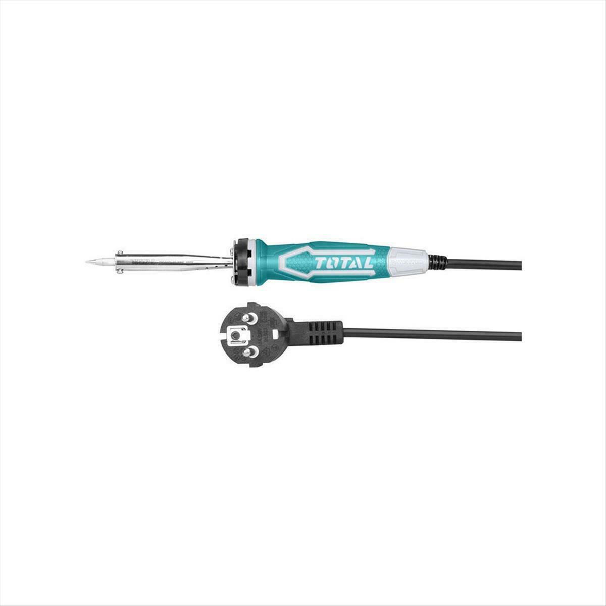 Κολλητήρι ηλεκτρικό TOTAL TET10006. Διαθέτει ευθεία μύτη μεγάλης αντοχής και διάρκειας. Περιλαμβάνει στήριγμα μύτης. Χρόνος προθέρμανσης: 3 – 5 λεπτά.