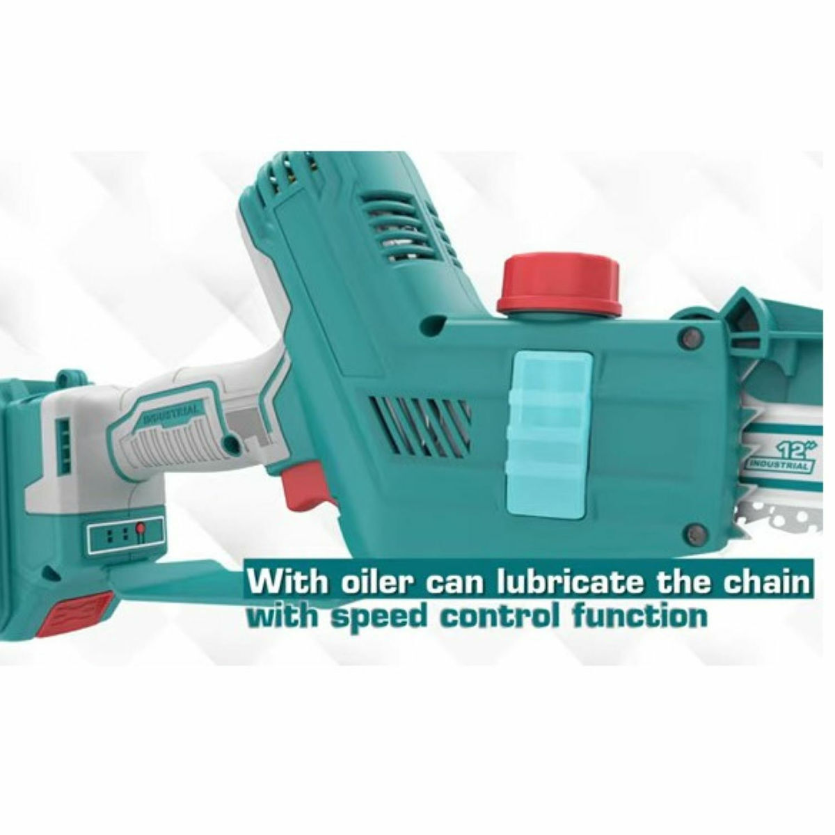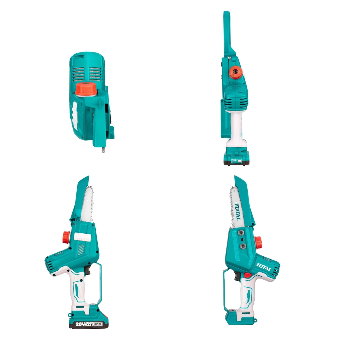 Το αλυσοπρίονο της Total λειτουργεί με μπαταρία Λιθίου (Li-on) 20 volt, δεν παράγει καυσαέρια και μπορείτε να κινηθείτε ελεύθερα καθώς δεν εξαρτάται από καλώδια και πρίζες. Η διάρκεια εργασίας εξαρτάται από την μπαταρία και το πόσο φορτισμένη είναι. Με βάρος 1.5 κιλά και μήκος λάμας 15cm, είναι κατάλληλο για κλάδεμα δέντρων και σκάλισμα ξύλων.