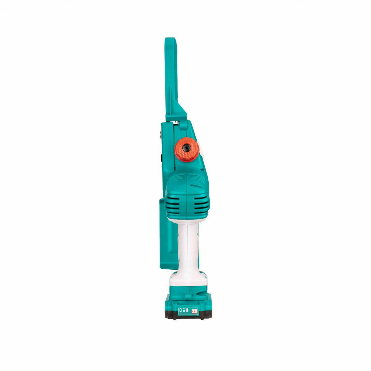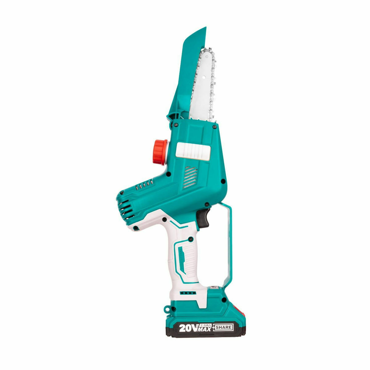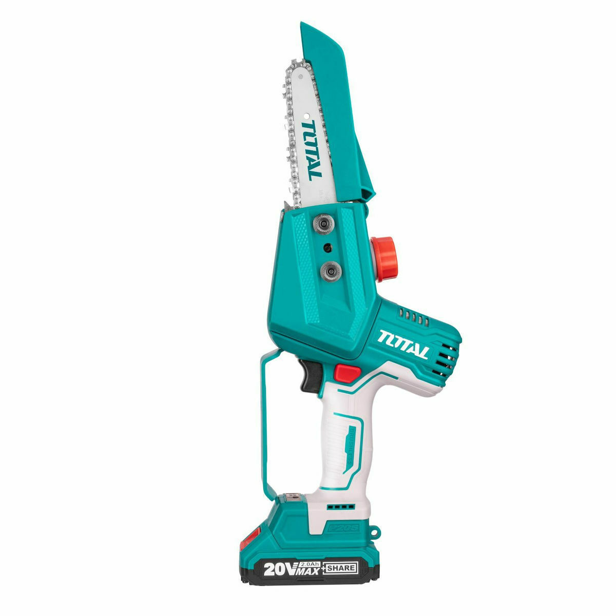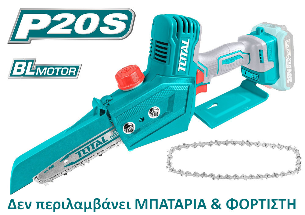 Το αλυσοπρίονο της Total λειτουργεί με μπαταρία 20 volt, δεν παράγει καυσαέρια και μπορείτε να κινηθείτε ελεύθερα καθώς δεν εξαρτάται από καλώδια και πρίζες. Η διάρκεια εργασίας εξαρτάται από την μπαταρία και το πόσο φορτισμένη είναι. Με βάρος 1.66 κιλά και μήκος λάμας 13cm, είναι ιδανικό για κλάδεμα δέντρων και σκάλισμα ξύλων. Επίσης περιλαμβάνει δοχείο λαδιού.