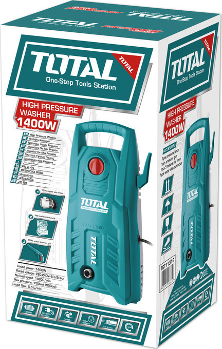 Το πλυστικό μηχάνημα της Total λειτουργεί με ρεύμα και πρέπει να συνδεθεί στην παροχή νερού. Η μέγιστη πίεση του πλυστικού είναι 130 bar και η μέγιστη ροή νερού 330 lt/h, και μπορεί να ανταποκριθεί πλήρως στις περισσότερες εργασίες καθαρισμού ενός σπιτιού (π.χ. πλύσιμο αυτοκινήτου, αυλής, χαλιών, αφαίρεση μούχλας).