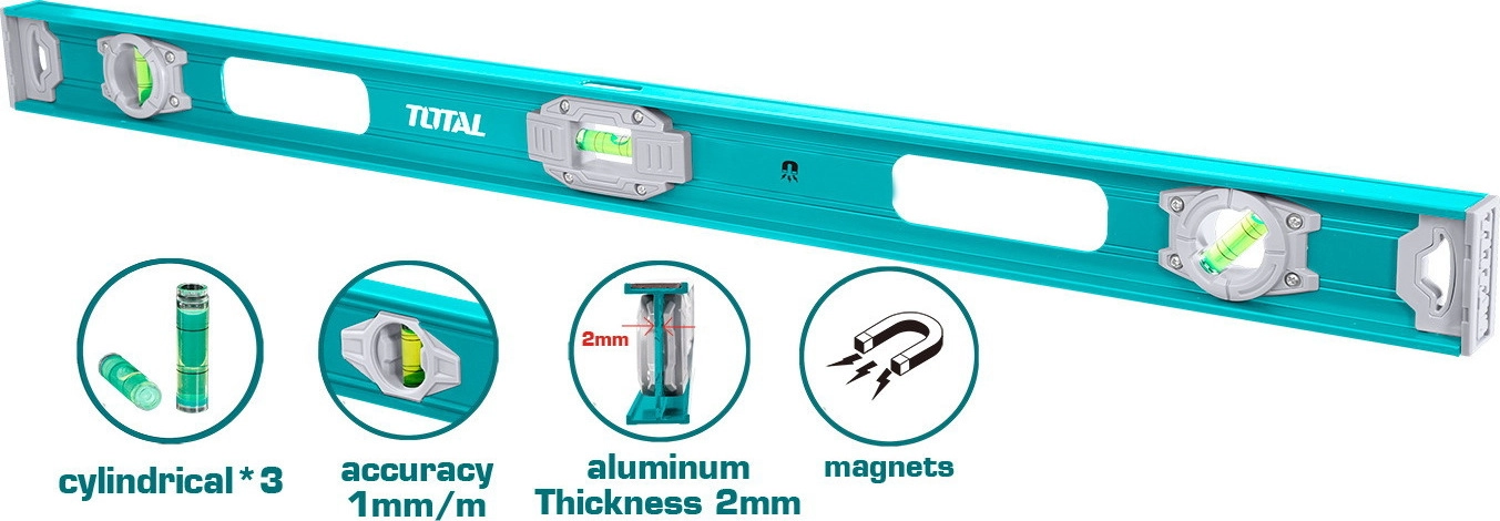 Αλφάδι αλουμινίου μαγνητικό, με λαστιχένιες άκρες για τη προφύλαξη του από το πέσιμο. Διαθέτει 3 μάτια οριζόντιο, κάθετο και 45 μοιρών για όλες τις εργασίες αλφαδιάσματος. Με 2 λάβες, επενδυμένες με λάστιχο, για εύκολο πιάσιμο. Total TMT210026 Αλφάδι Αλουμινίου Μαγνητικό 100εκ. με 3 μάτια