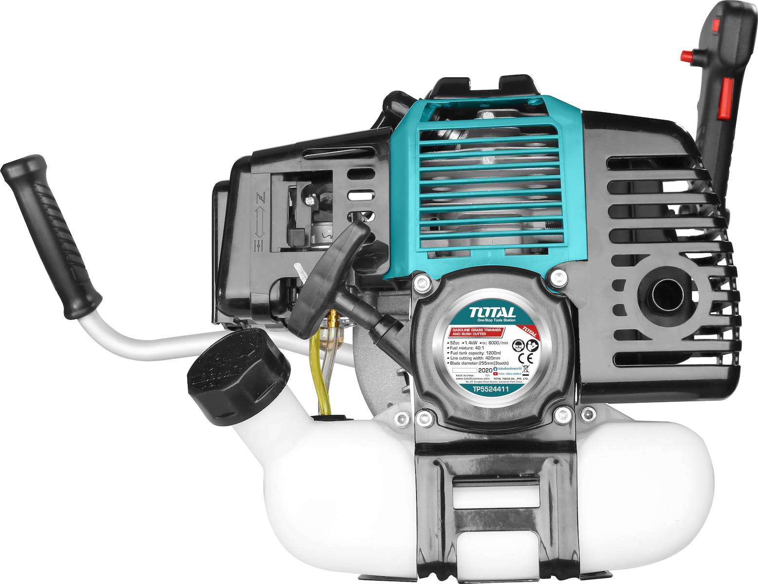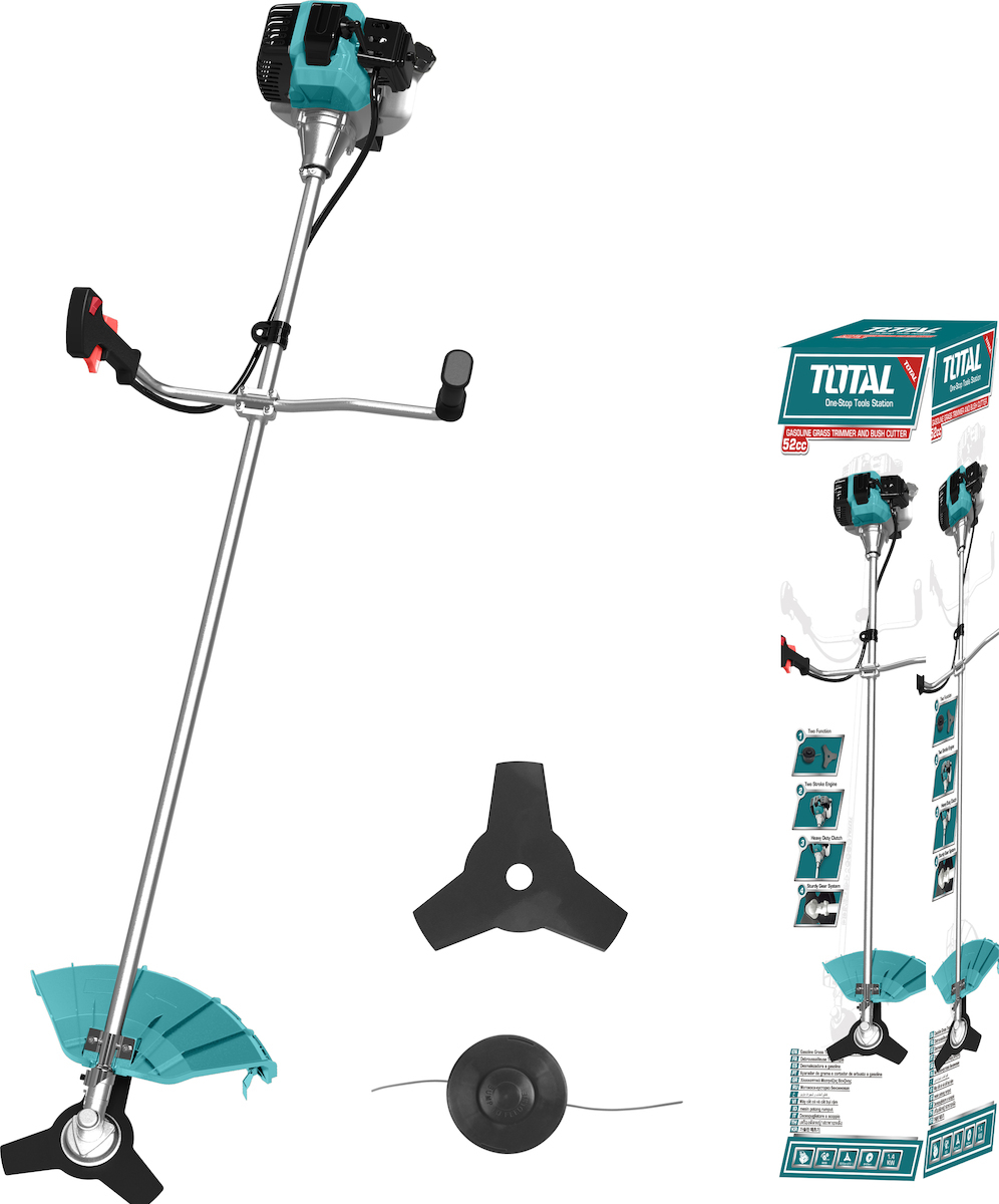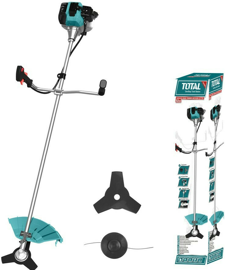 Βενζινοκίνητο θαμνοκοπτικό χειρός κατασκευασμένο από την εταιρεία Total, το οποίο έχει δίχρονο κινητήρα με ιππoδύναμη 2.2hp και κυβισμό 52cc. Διαθέτει λαβή ποδηλάτου και σύστημα κοπής με μεσινέζα & δίσκο που το καθιστά κατάλληλο για κοπή γρασιδίου, χόρτων ακόμα και σε δύσβατα σημεία με πέτρες. Το βάρος του αγγίζει τα 10kg.