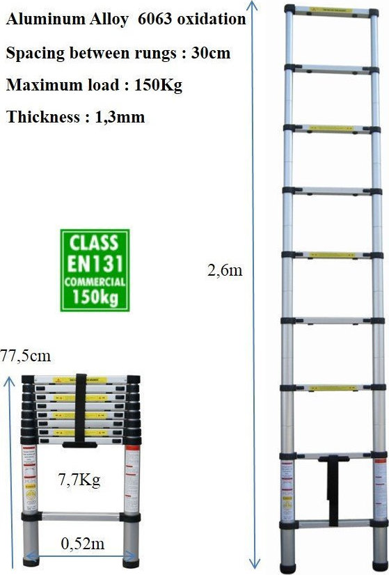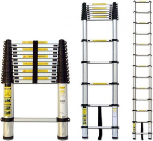 Πτυσσόμενη τηλεσκοπική σκάλα κατασκευασμένη από κράμα αλουμινίου για μεγάλη σταθερότητα και αντοχή. Μεταφέρεται και αποθηκεύεται εύκολα.