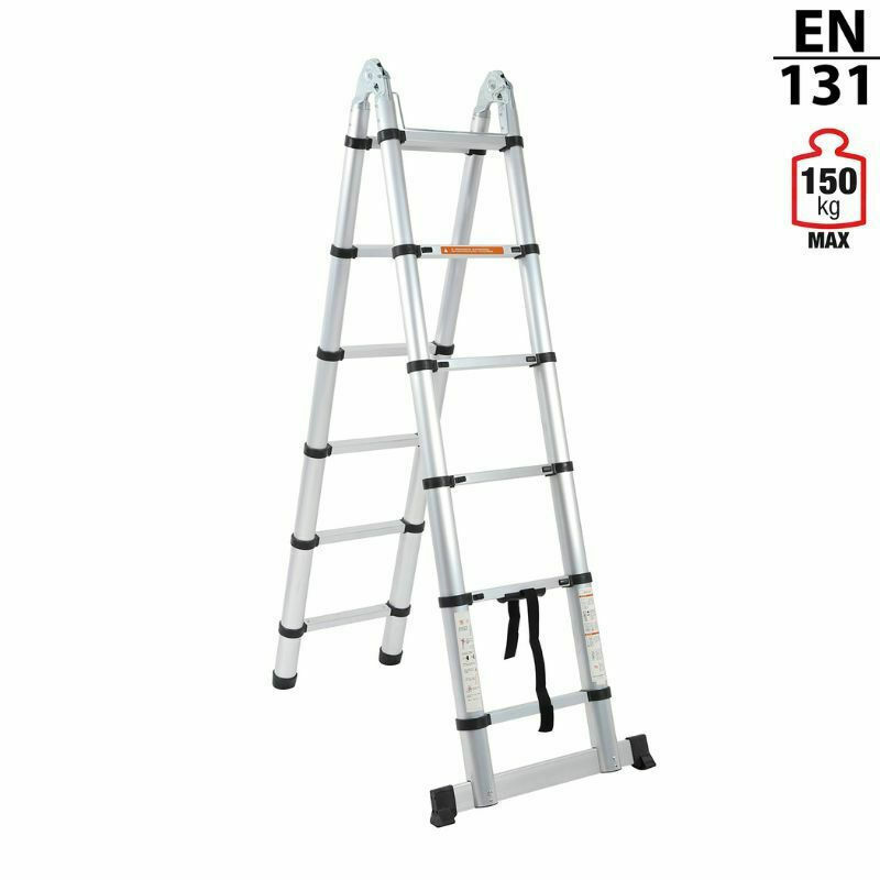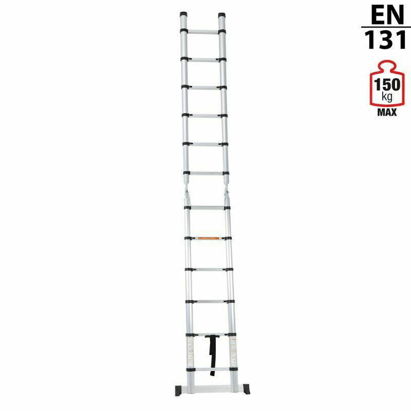 Τηλεσκοπική σκάλα με 12 (6+6) σκαλιά, κατασκευασμένη εξ’ολοκλήρου από αλουμίνιο με πλαστικές λεπτομέρειες. Συμπαγής κατασκευή που συνδυάζει ρυθμιζόμενο ύψος (από 82 έως 380 εκατοστά), μεγάλη αντοχή βάρους (έως 150kg) και μικρό βάρος κατασκευής (μόλις 13,1kg).