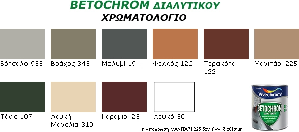 Το Betochrom διαλυτικού είναι ειδικό ακρυλικό τσιμεντόχρωμα διαλύτου που προστατεύει αποτελεσματικά τις επιφάνειες από μπετό όπως δάπεδα για καθημερινή χρήση και ήπια καταπόνηση, σκάλες, πλακόστρωτα, πεζοδρόμια, αυλές, γκαράζ και τοίχους. Συνιστάται ιδιαίτερα για εμφανές μπετόν γιατί προστατεύει τον φέροντα οπλισμό απο τη διάβρωση. Εφαρμόζεται εύκολα και έχει ισχυρή πρόσφυση, μεγάλη καλυπτικότητα και μεγάλες αντοχές στις δυσμενείς καιρικές συνθήκες. Επίσης είναι κατάλληλο για στέγες απο κεραμίδια και άλλα δομικά υλικά. Στεγνώνει γρήγορα και δίνει ένα ματ και σκληρό τελείωμα με μεγάλες αντοχές στην ατμοσφαιρική ρύπανση και στις δύσκολες καιρικές συνθήκες. Vivechrom Τσιμεντόχρωμα Betochrom 3lt Κεραμιδί N23