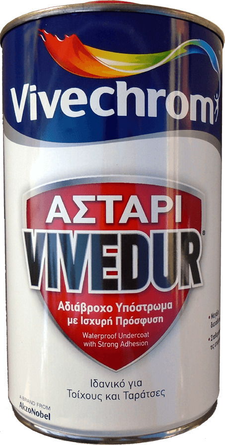 To VIVEDUR είναι υψηλής ποιότητας αδιάβροχο ακρυλικό αστάρι διαλύτη και είναι ιδανικό για τοίχους και ταράτσες. Έχει ισχυρή πρόσφυση και μεγάλη διεισδυτικότητα για επιφάνειες που βάφονται με πλαστικά και ακρυλικά χρώματα. Επιτυγχάνει το δέσιμο και τη σταθεροποίηση της επιφάνειας ενισχύοντας έτσι την καλύτερη πρόσφυση του τελικού χρώματος. Vivechrom Vivedur Αδιάβροχο Υπόστρωμα Βάσεως Διαλύτου Κατάλληλο για Τοιχοποιία 1lt